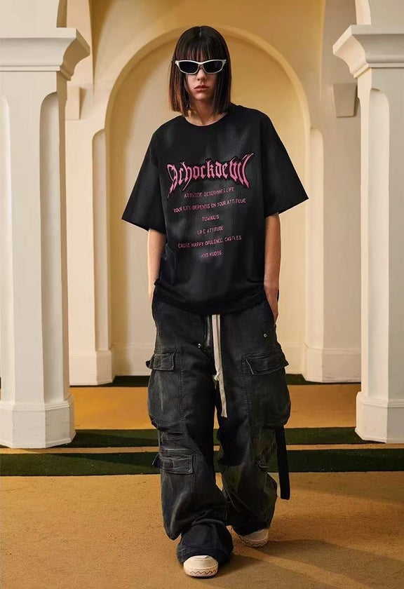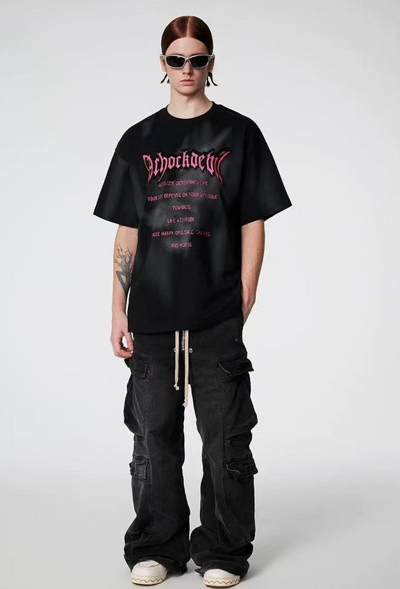 ACHOCK Embroidered Washed Black Distressed T-shirt