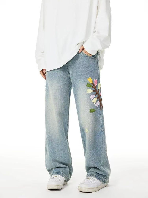 ACHOCK Floral Embroidered Heavy Duty Jeans