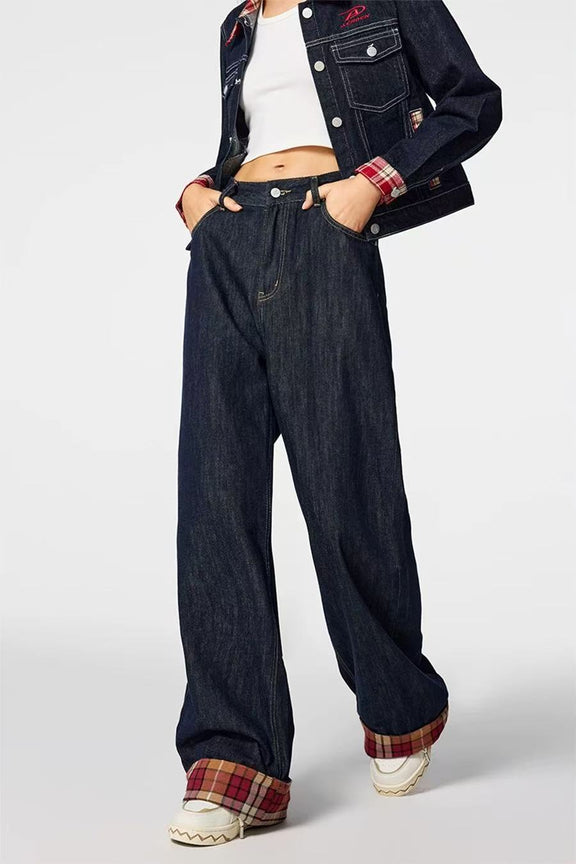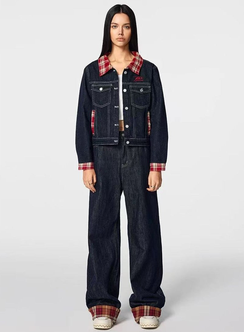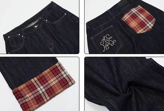 ACHOCK Plaid Patchwork Design Denim Jeans