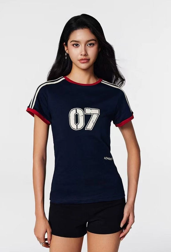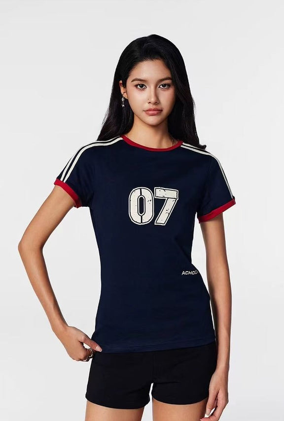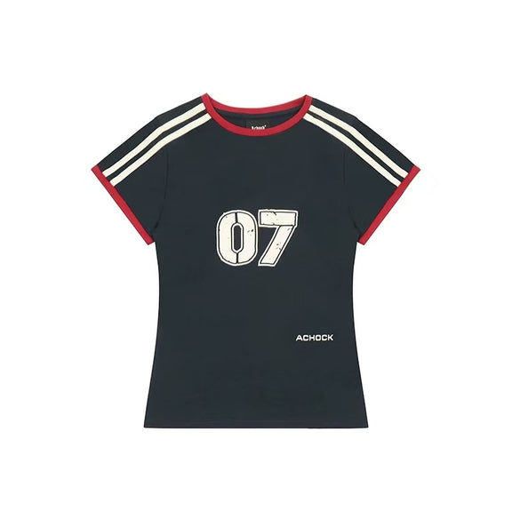 ACHOCK Retro Contrast Stripe Stitching Slimming Short-sleeved T-shirt (For Women)