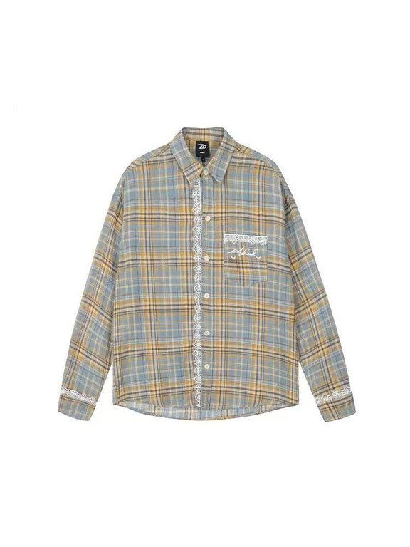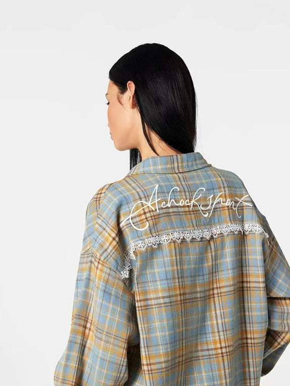 ACHOCK Retro Plaid Lace Splicing Long-sleeve Shirt