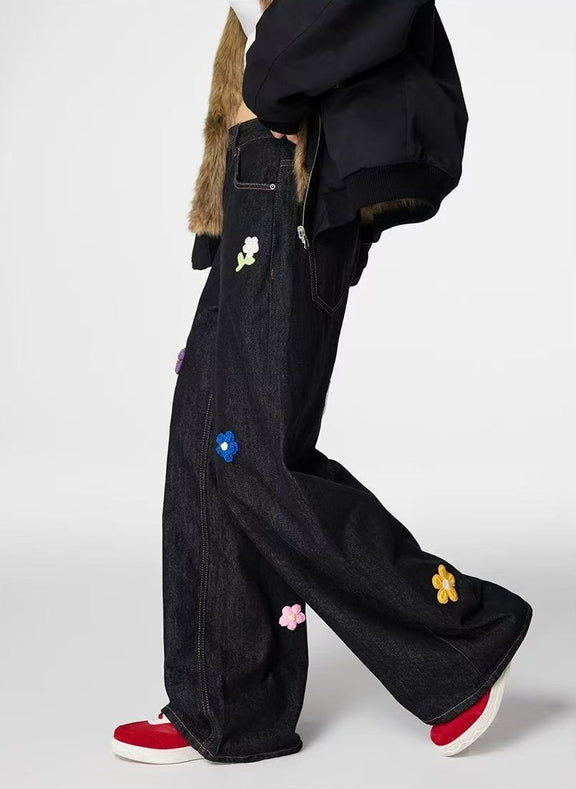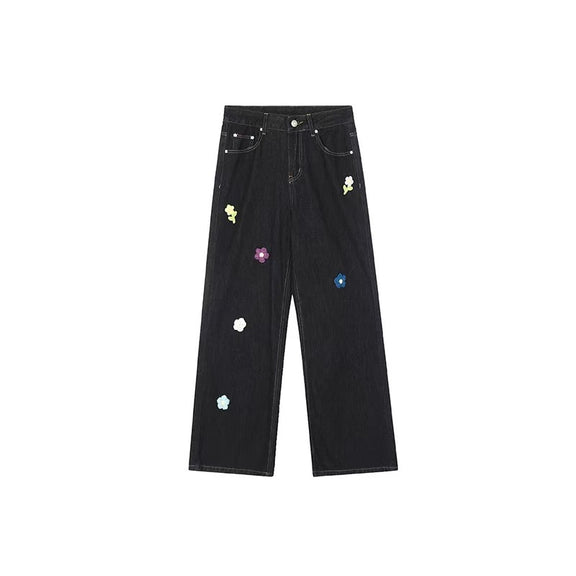 ACHOCK Small Flower Embroidered Washed Jeans (For Women)