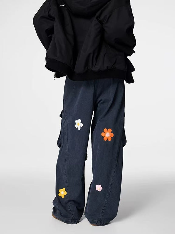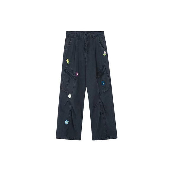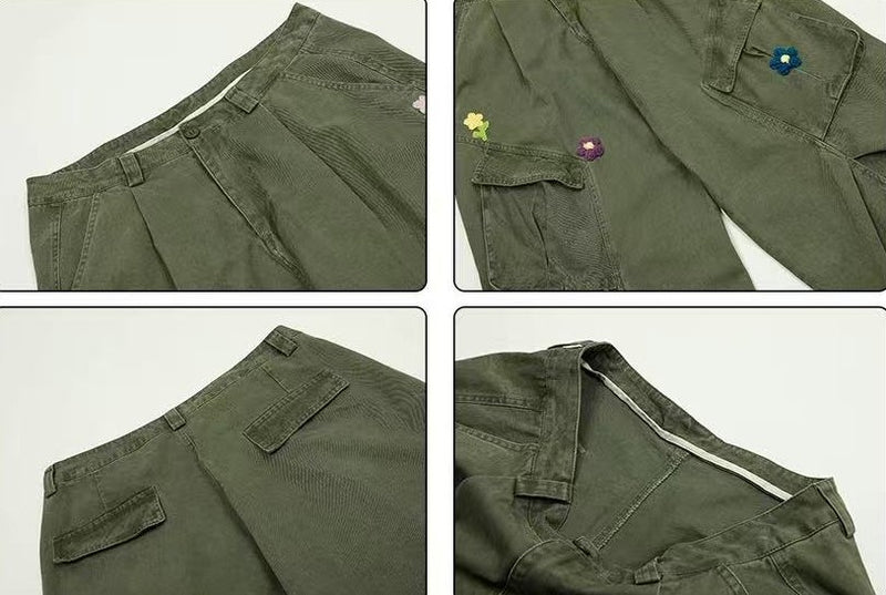 ACHOCK Vintage Multi-pocket Floral Embroidered Paratrooper Pants