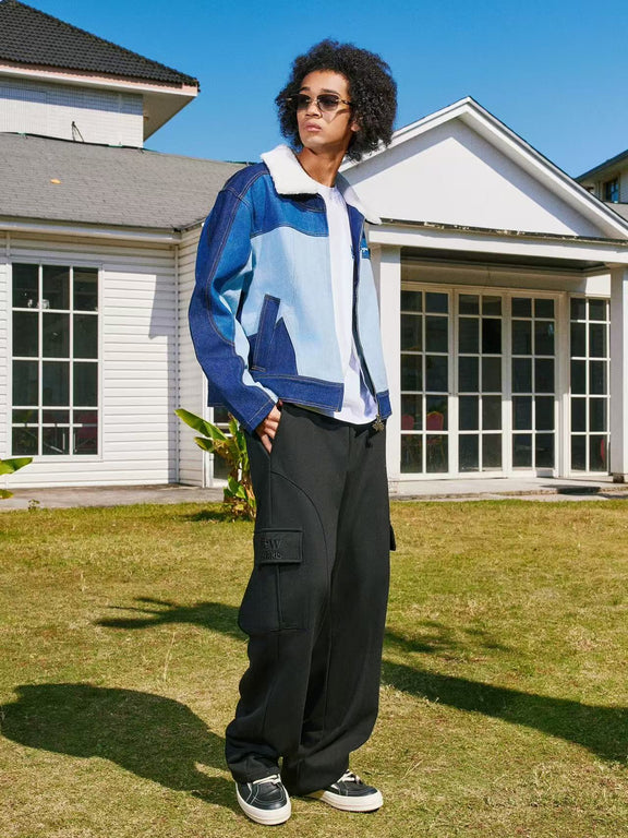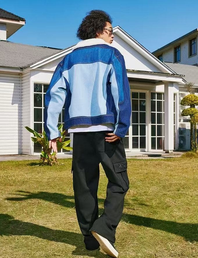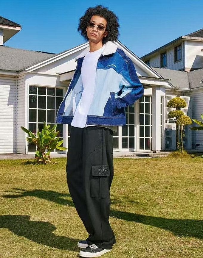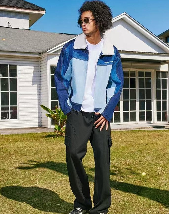 AFGK Spliced Fur Collar Denim Letter Embroidery Jacket