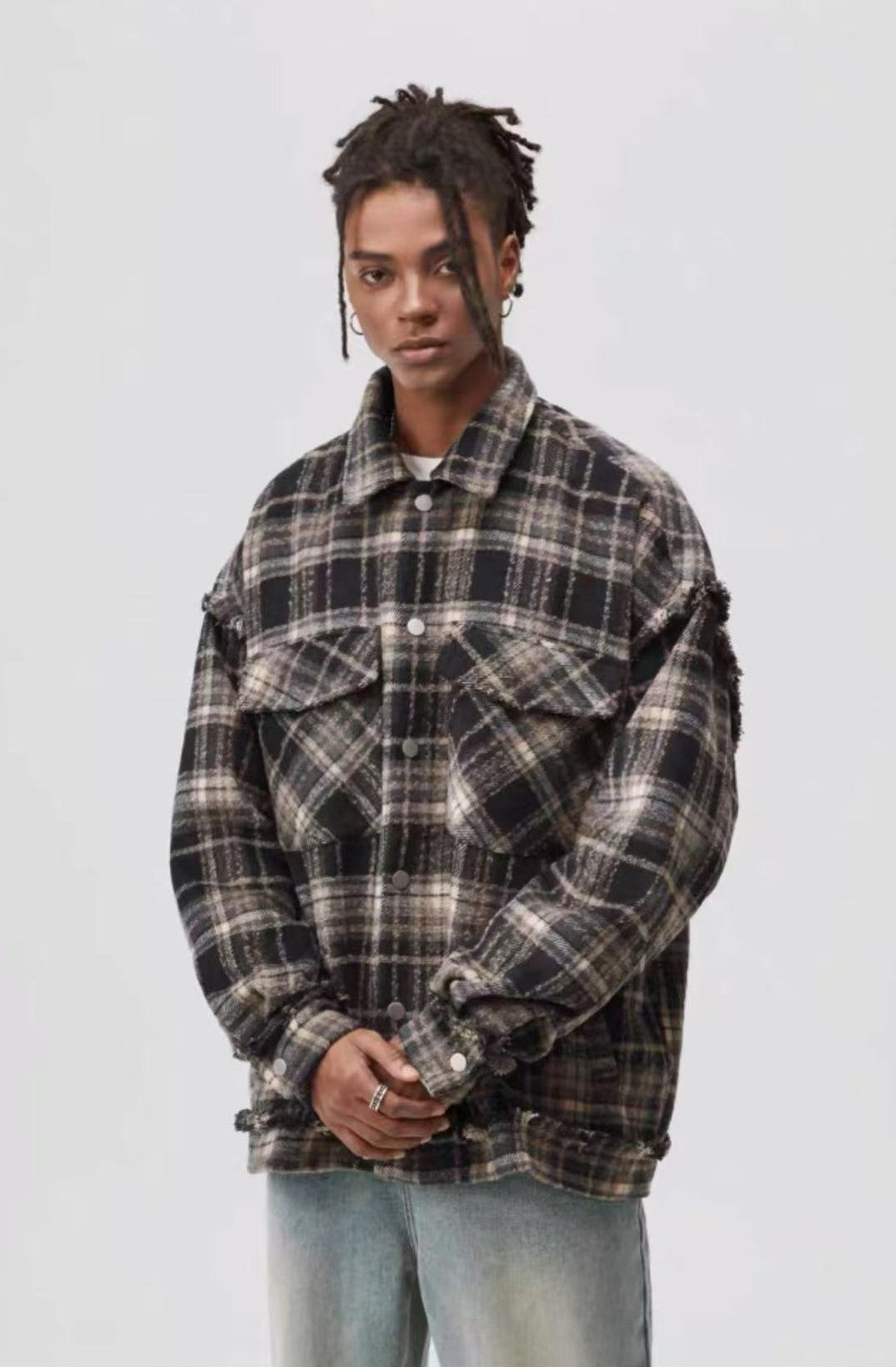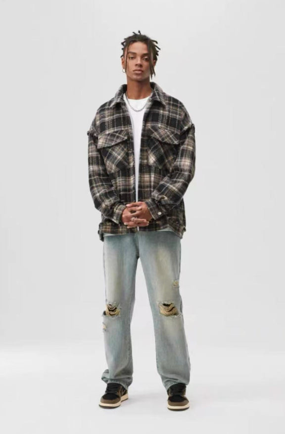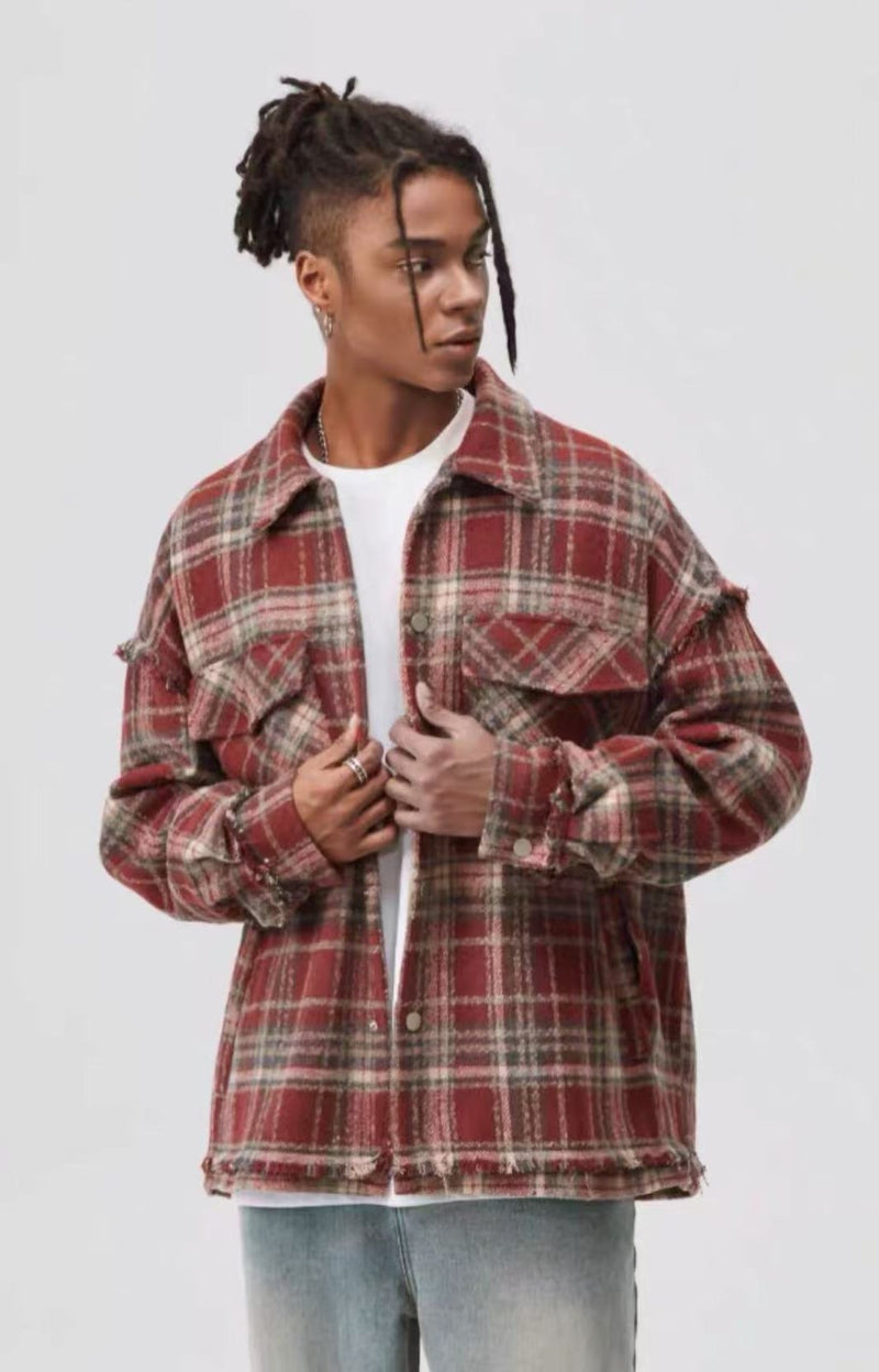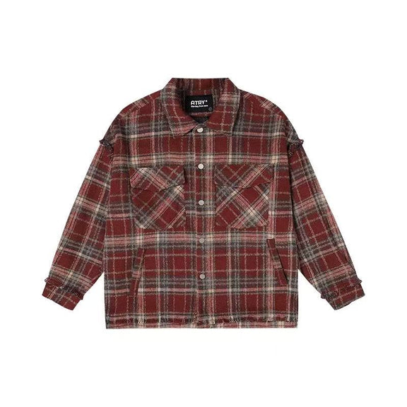 ATRY Washed Distressed Vintage Plaid Raw Edge Jacket