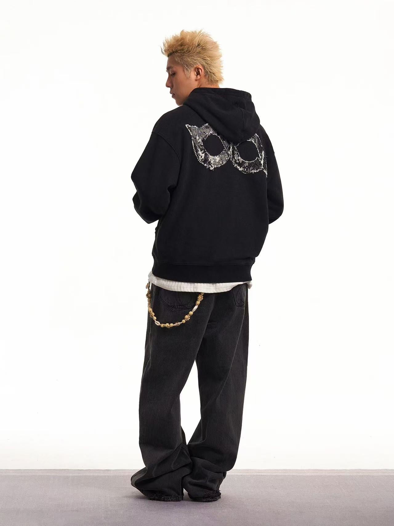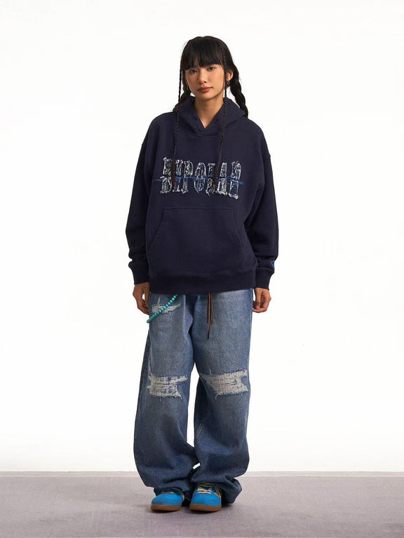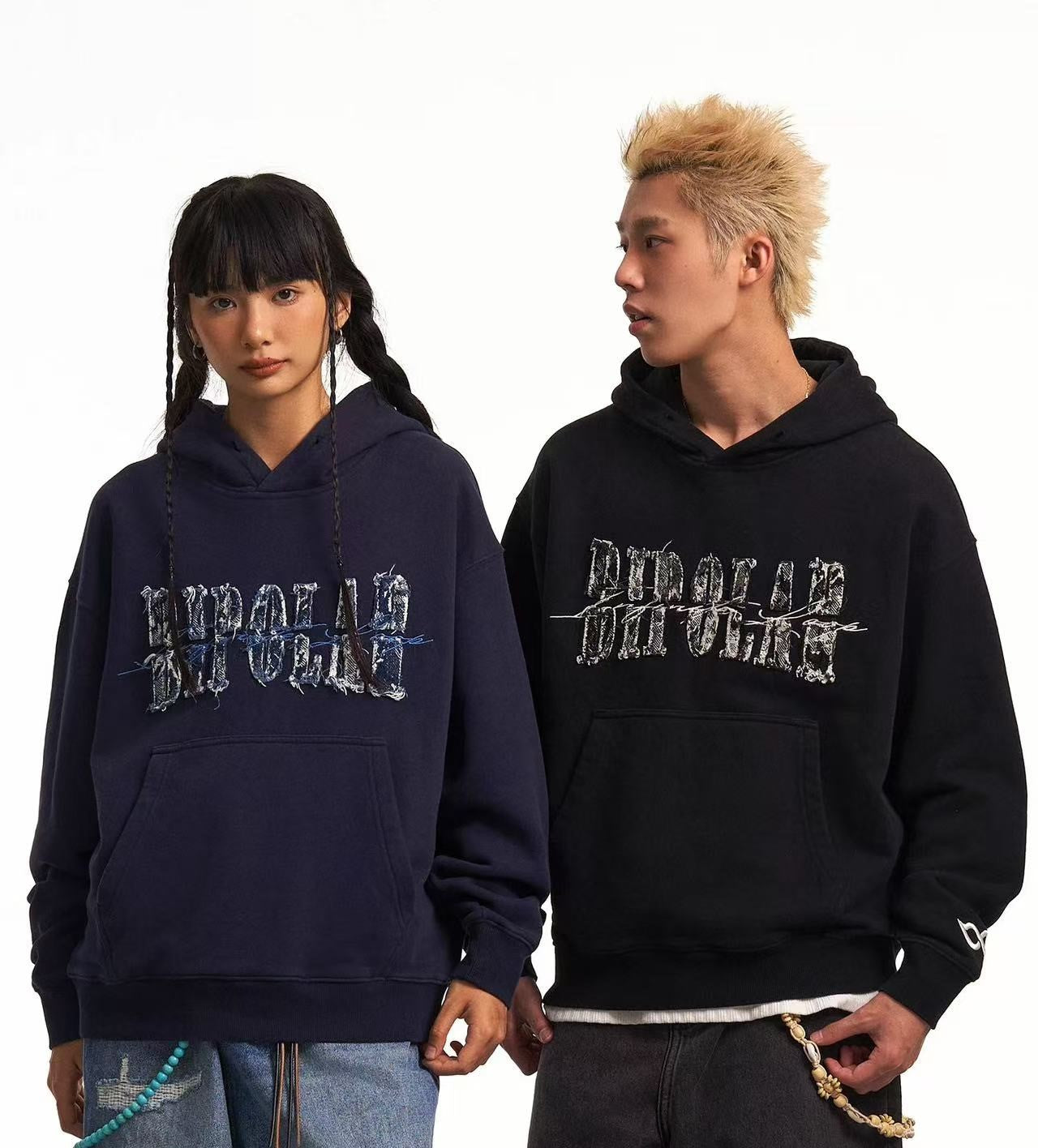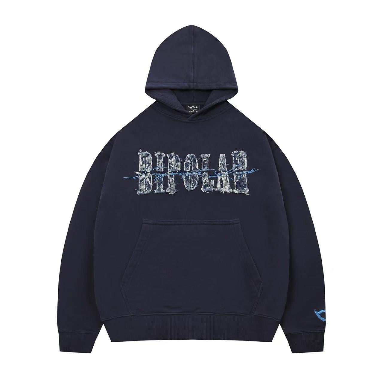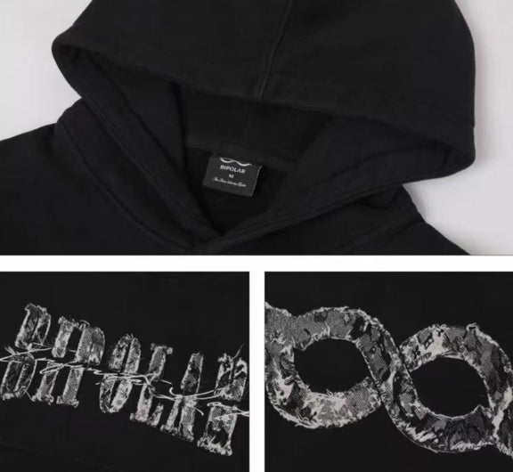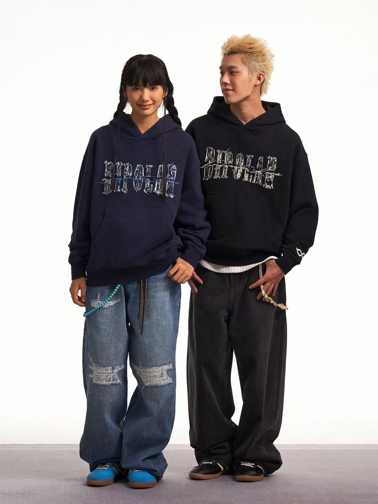 BIPOLAR Destroyed and Torn Creative Design Denim Patch Hoodie