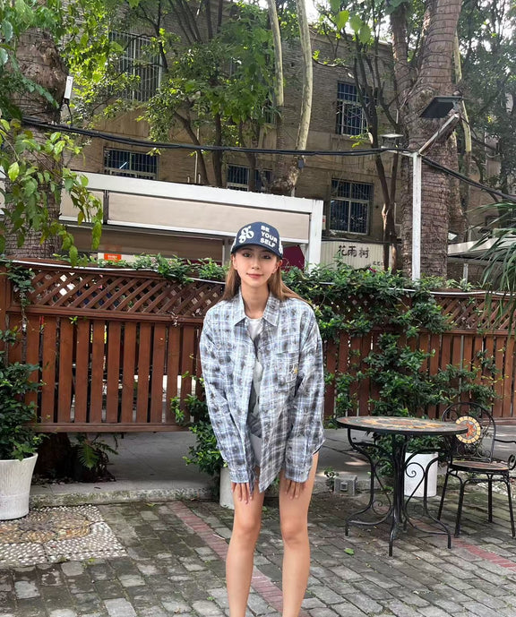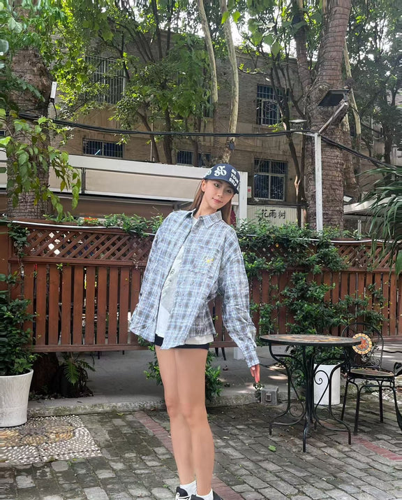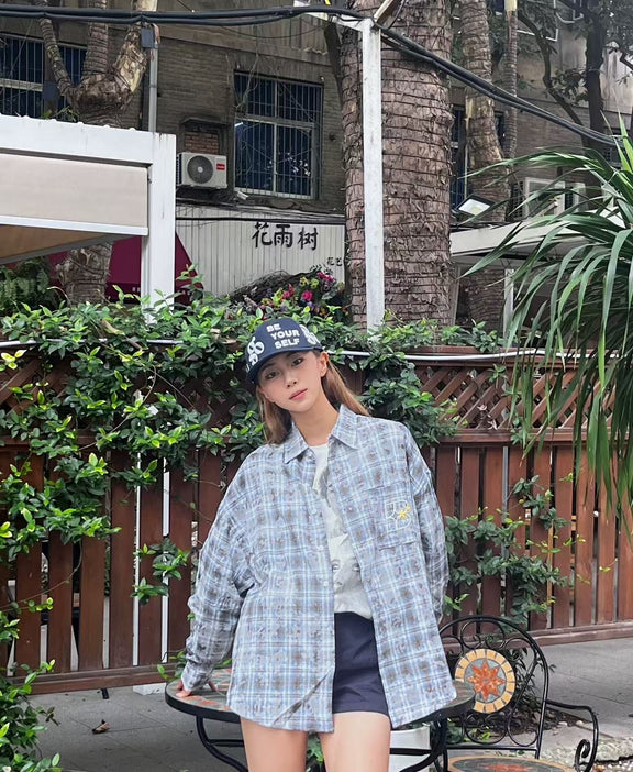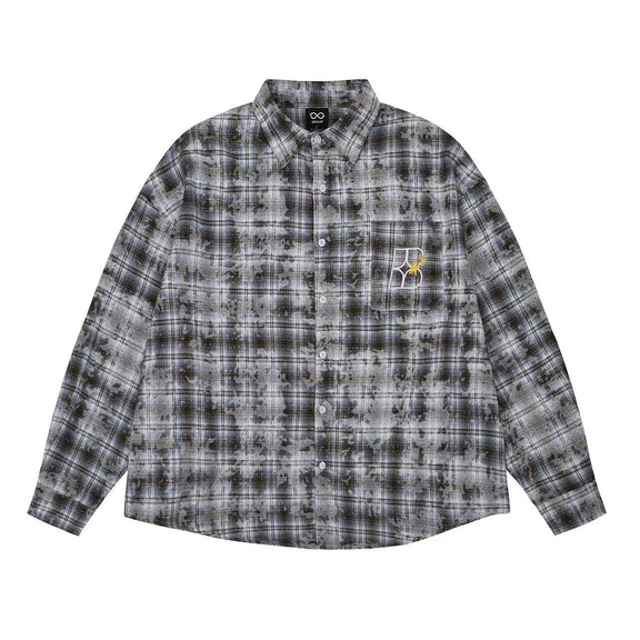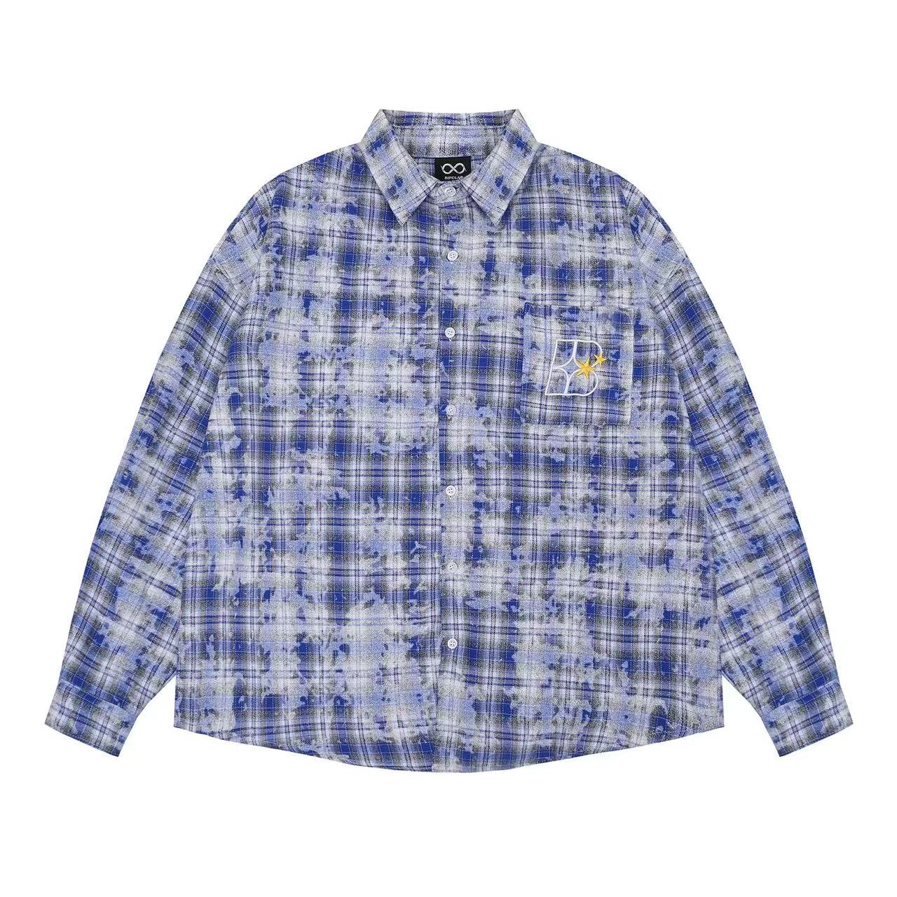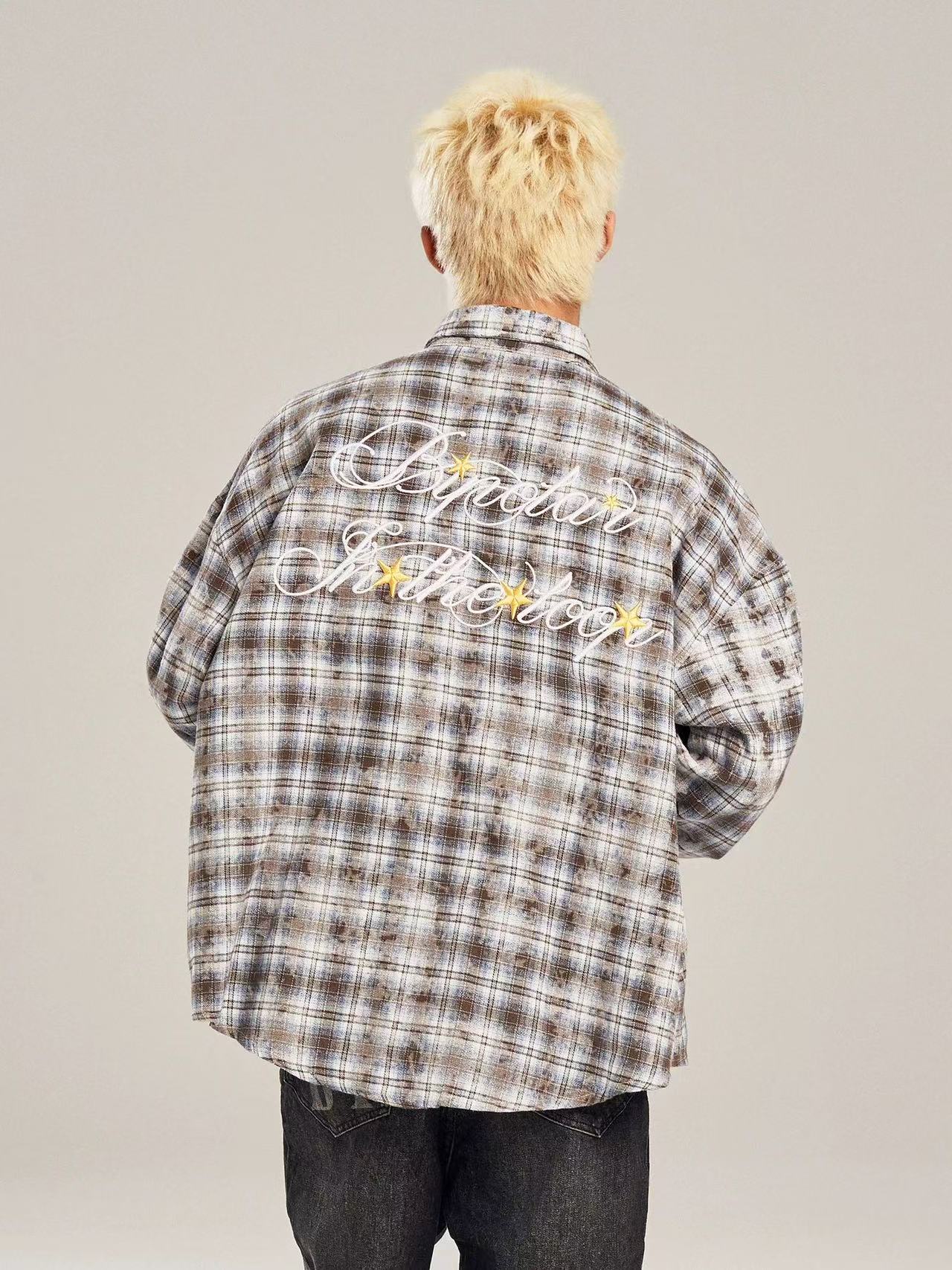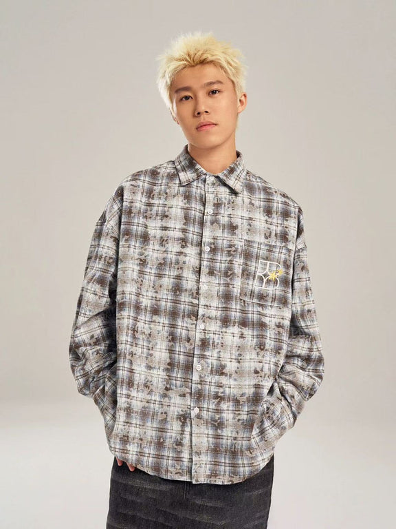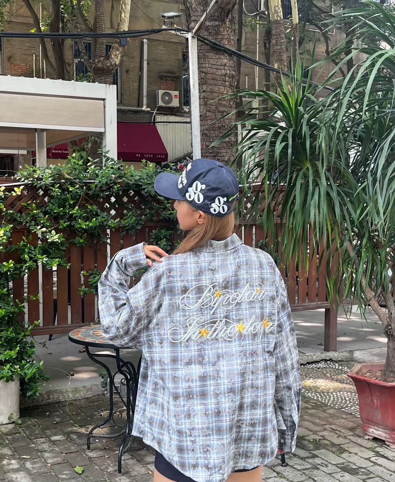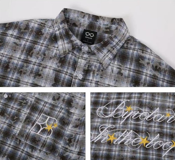 BIPOLAR Retro Floral Letter Embroidered Tie-dye Plaid Shirt