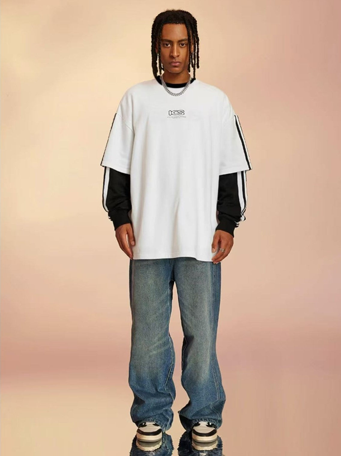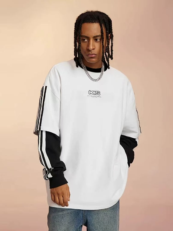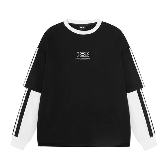 ICONSLAB Striped Webbing Fake Two-piece loose Pullover Crew Neck Sweatshirt