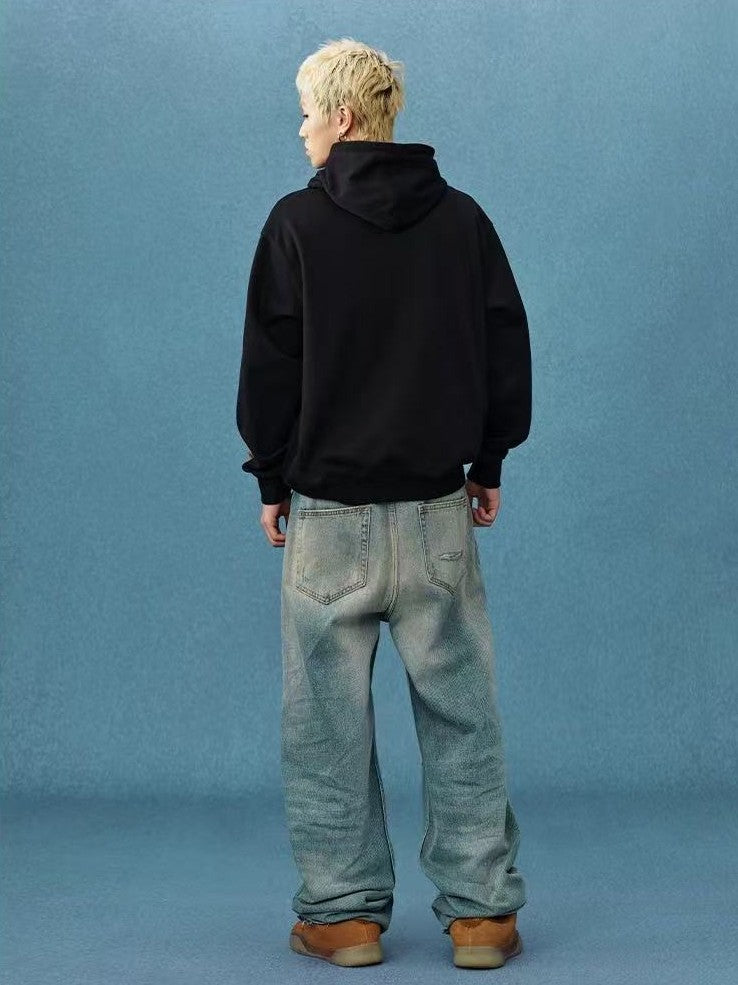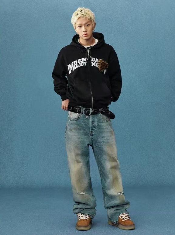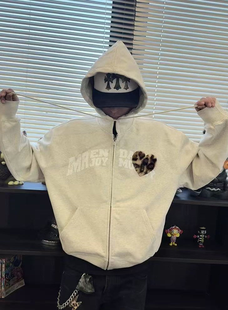 MEDM Distressed Font Heart Plush Leopard Print Zip Hoodie