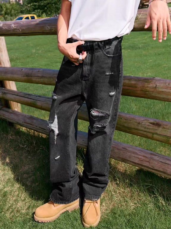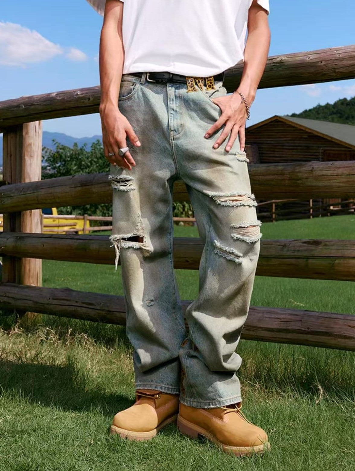 MEDM Large Letter Patch Leather Washed Ripped Jeans