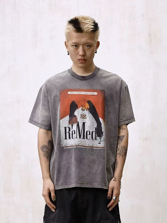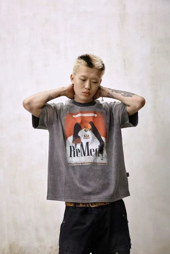 REMEDY Distressed Marlboro Design Short-sleeve T-Shirt