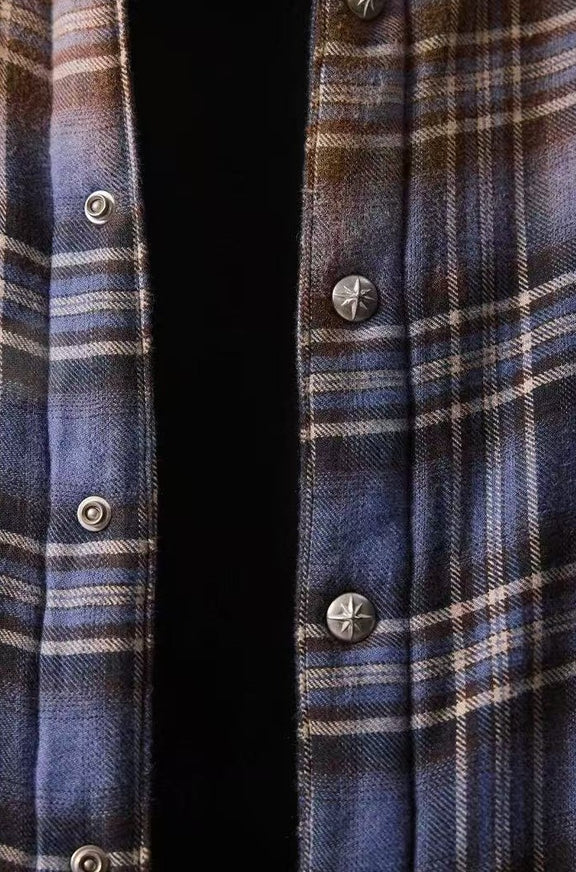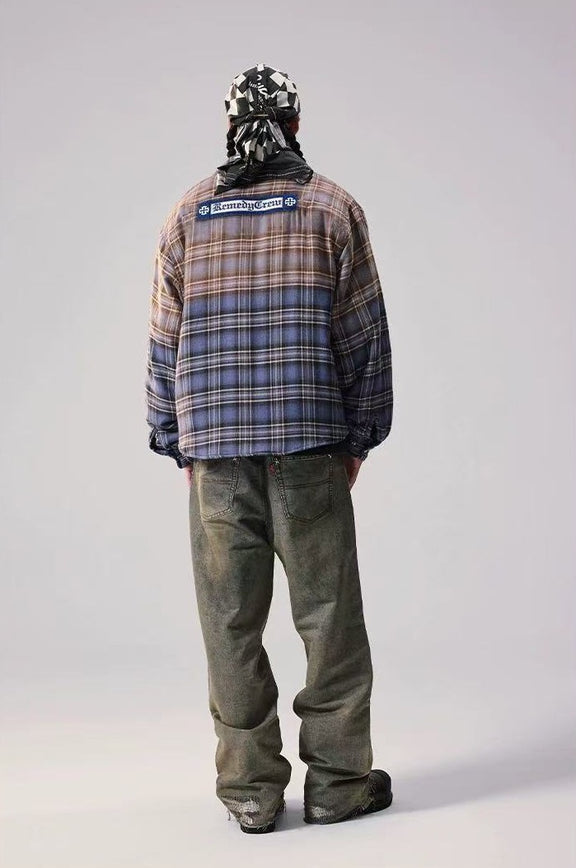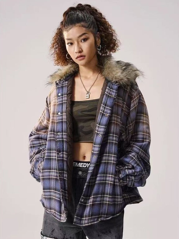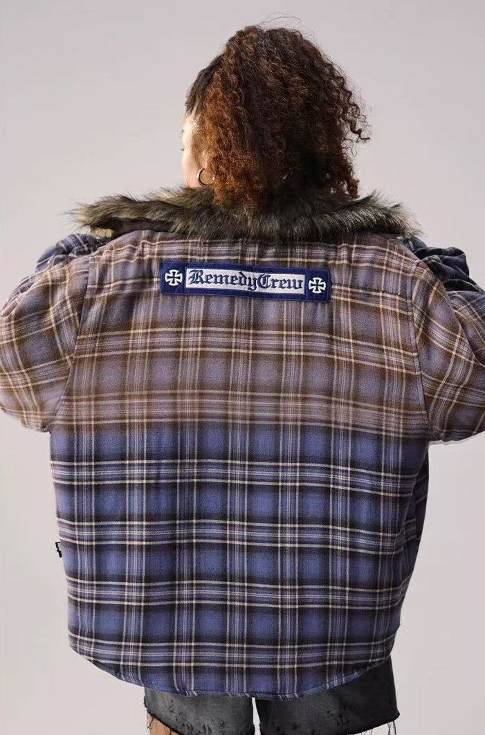 REMEDY Thickened Gradient Distressed Plaid Fur Collar Cotton Coat